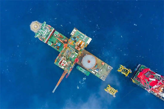 ▲航拍我國最大的動力定位浮托平臺海上安裝