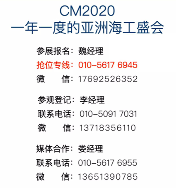 2020年7月3日-5日,第十屆北京國際海洋工程技術與裝備展覽會(CM2020),將在北京·中國國際展覽中心(新館)舉辦。屆時,CM2020將搭建船海裝備展示交流大平臺,來自全球65個國家和地區(qū)的1800家展商將薈聚北京,與120000專業(yè)觀眾一道,共襄一年一度的亞洲海工盛會。