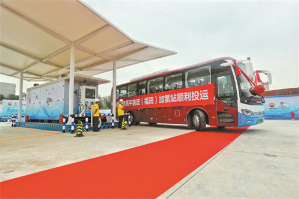 完成氫燃料加注的氫燃料電池客車駛出加氫站。