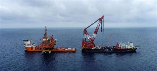 ▲我國最大的動力定位浮托平臺上部組塊與導(dǎo)管架完成對接
